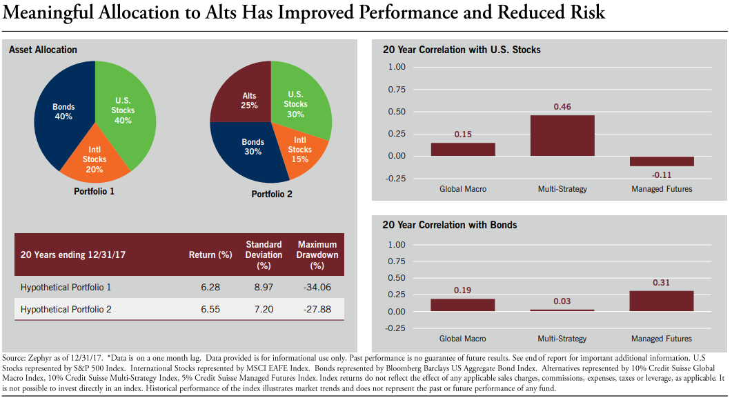 - The inclusion of liquid alts provides an allocation to an asset class that will have a low or negative correlation to a typical equity/bond portfolio.