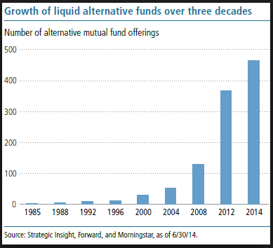 After the dotcom crash of the early 2000s, large institutional investors, such as endowments and pensions, began to seek alternative strategies to better protect their portfolios during turbulent times. These large institutions sought out hedge funds and other large money managers that could provide better protection during difficult times. During the 2007-2009 financial crisis, these strategies showed their worth and had significantly reduced risk. After seeing the benefits these strategies had provided, fund companies began to replicate these strategies on a larger scale for retail investors and asset managers in the form of liquid alternatives. (see image #1 below)